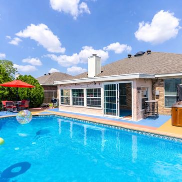 Relax and enjoy the sound of the waterfall in the heated pool and hot tub in this secluded backyard. The sunroom is perfect for enjoying a good book, or playing a friendly game of foosball.